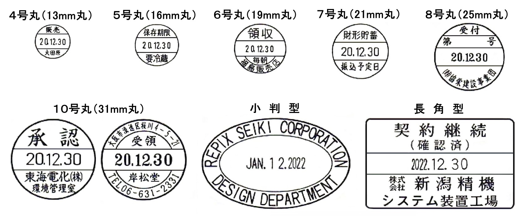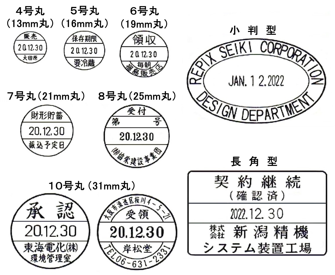 - データー印のタイプは2種類で、普通紙捺印用(リピエックス)と非吸収面捺印用(スペシャルリピエックス)がございます。 また、サイズ展開は全9サイズと豊富です。使用用途に応じた種類、サイズ、形状をお選び下さい。
